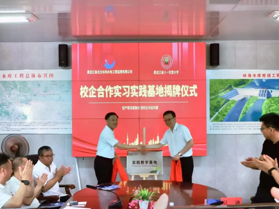 最后,双方领导共同为黑龙江八一农垦大学-黑龙江省北方水利水电监理有限公司校企合作实习实践基地揭牌。