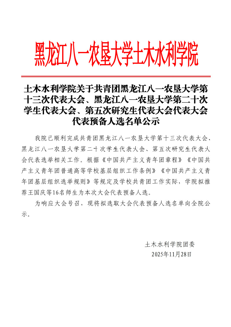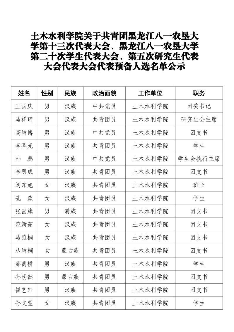 土木水利学院关于共青团黑龙江八一农垦大学第十三次代表大会、黑龙江八一农垦大学第二十次学生代表大会、第五次研究生代表大会代表大会代表预备人选名单公示