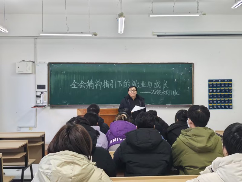 副院长刘少东深入毕业生班级—水利专业1班,围绕“全会精神指引下的就业与成长”开展专题分享。他结合当前就业形势与行业发展趋势,解读了全会提出的“建设现代化产业体系”对人才需求的新变化 ,为毕业生提供职业规划指导与就业信息支持。他勉励毕业生立足专业所长,树立正确就业观,主动对接国家战略需求与市场发展方向,在基层一线、重点领域建功立业,同时表示学院将持续优化就业服务,为毕业生高质量就业保驾护航。