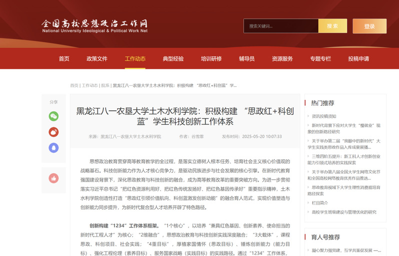 5月20日,全国高校思想政治工作网刊发谷雪霏撰写的《黑龙江八一农垦大学土木水利学院:积极构建“思政红+科创蓝”学生科技创新工作体系》。2025年度,学校共有3篇稿件以校级名义被该网报道,我院是唯一以学院名义入选的单位。