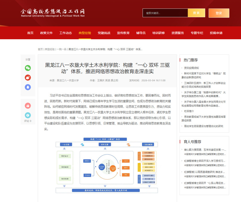 近日,全国高校思想政治工作网“典型经验一院一品”专栏刊发了《黑龙江八一农垦大学土木水利学院:构造“一心 双环 三驱动”体系,推进网络思想政治教育走深走实》。此案例由王国庆、吴迪、路之阳共同撰写,系统总结凝练了学院在网络思想政治教育方面的创新探索与实践成果。