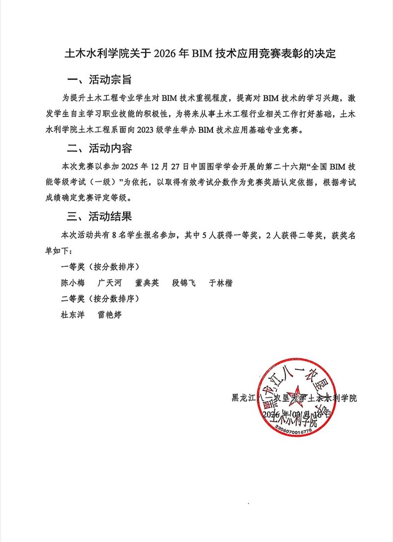 此次活动,是学院强化实践育人、深化产教融合的重要举措,进一步激发了学生学习专业技能、钻研前沿技术的热情。接下来,学院将以技能竞赛为抓手,持续推进BIM等前沿技术与专业教学、实践环节的深度融合,不断完善实践教学体系,助力学生成长为适应行业发展和社会需求的高素质应用型土木水利人才。