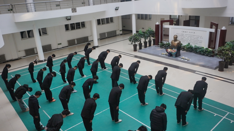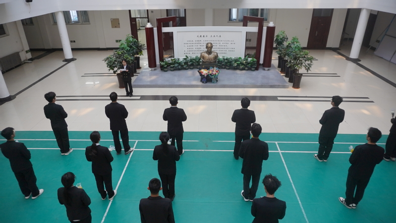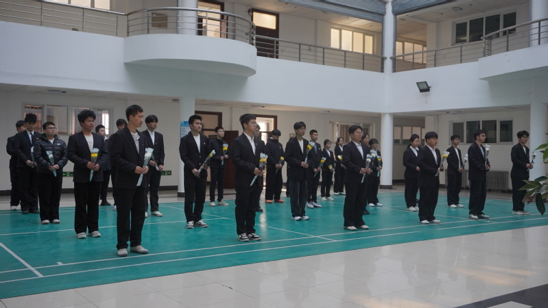 学子们身着正装,佩戴团徽,肃立于学院大厅,共同追思先辈,主持人刘书琪深情回顾王泰恩教授生平,讲述其一生践行北大荒精神的事迹。随后,全场肃立默哀一分钟,以无声之礼寄托无尽哀思,默哀后,学生依次缓步上前,将素菊轻置于王泰恩教授塑像旁,花瓣承载着追思与敬意,氤氲着对先辈的深切缅怀。最后,全体人员向王泰恩教授鞠躬致敬,以庄重之姿告慰先贤。